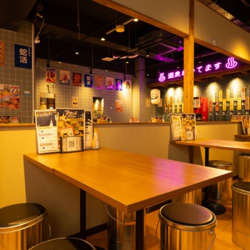 銭湯のをイメージした店内でゆったり銭湯気分♪テーブル席の一部は、銭湯の脱衣所をイメージしたつくりになっており、「風呂上がりに一杯」という雰囲気をそのまま楽しめるユニークなスペースになっています。