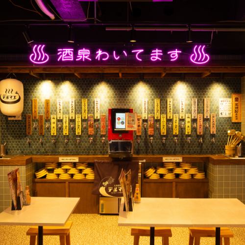壁一面に並んだ蛇口からお酒を注ぐセルフ式ドリンクステーション。飲み放題を注文すると、蛇口をひねって好みのお酒・度数・割り方で自由にカスタムできます!これほど蛇口が並ぶ光景は珍しく、店内の大きな“映えスポット”にもなっています♪